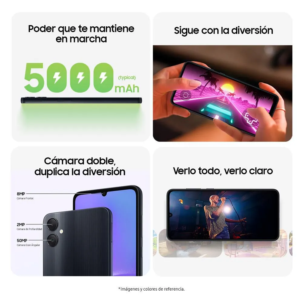 Este Galaxy A05 llamara tu atención con su espectacular pantalla HD+ y con la cámara doble que te ofrece mejor experiencia para obtener las mejores selfies. El Galaxy A05 cuenta con una potente batería de larga duracion y carga rápida para que lo disfrutes al maximo. Su capacidad de memoria te dará la tranquilidad de guardar todo lo que necesitas y recibir un excelente desempeño en tu smartphone.Sist. Ope. /Android 13.0 / Pantalla / 6,7 pulgadasCamara Principal / 50.0 MP Y 2.0 PM MP F1.8 , F2.4/ Camara Frontal 8.0 MP F2.0Octa-core (2×2.0 GHz Cortex-A75 & 6×1.8 GHz Cortex-A55Bateria / 5000mAh
