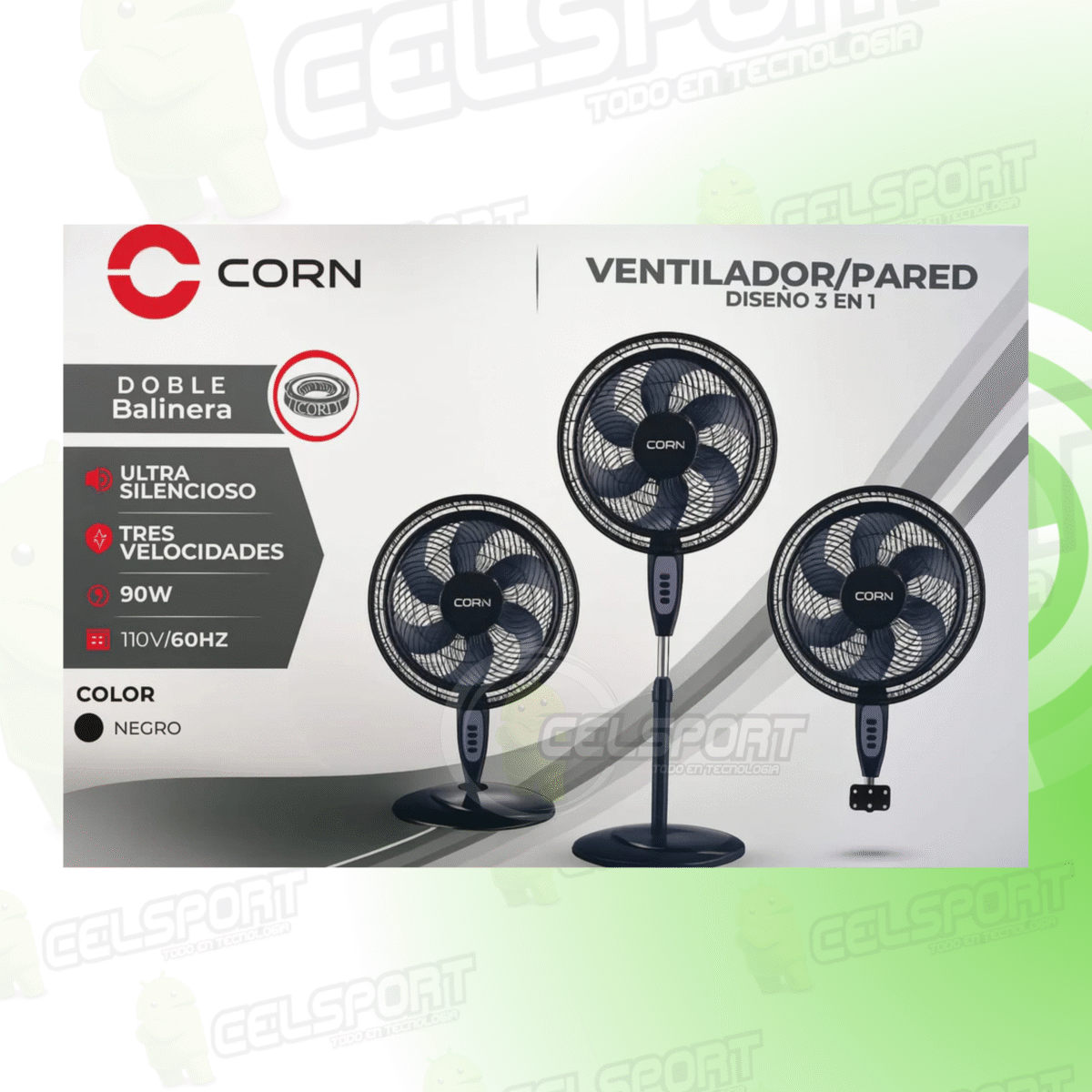 Disfruta de la máxima versatilidad con el Ventilador CORN 3 en 1, que puedes usar de pie, en mesa o montado en la pared según tus necesidades. Su diseño moderno y compacto lo convierte en el complemento perfecto para tu hogar u oficina.